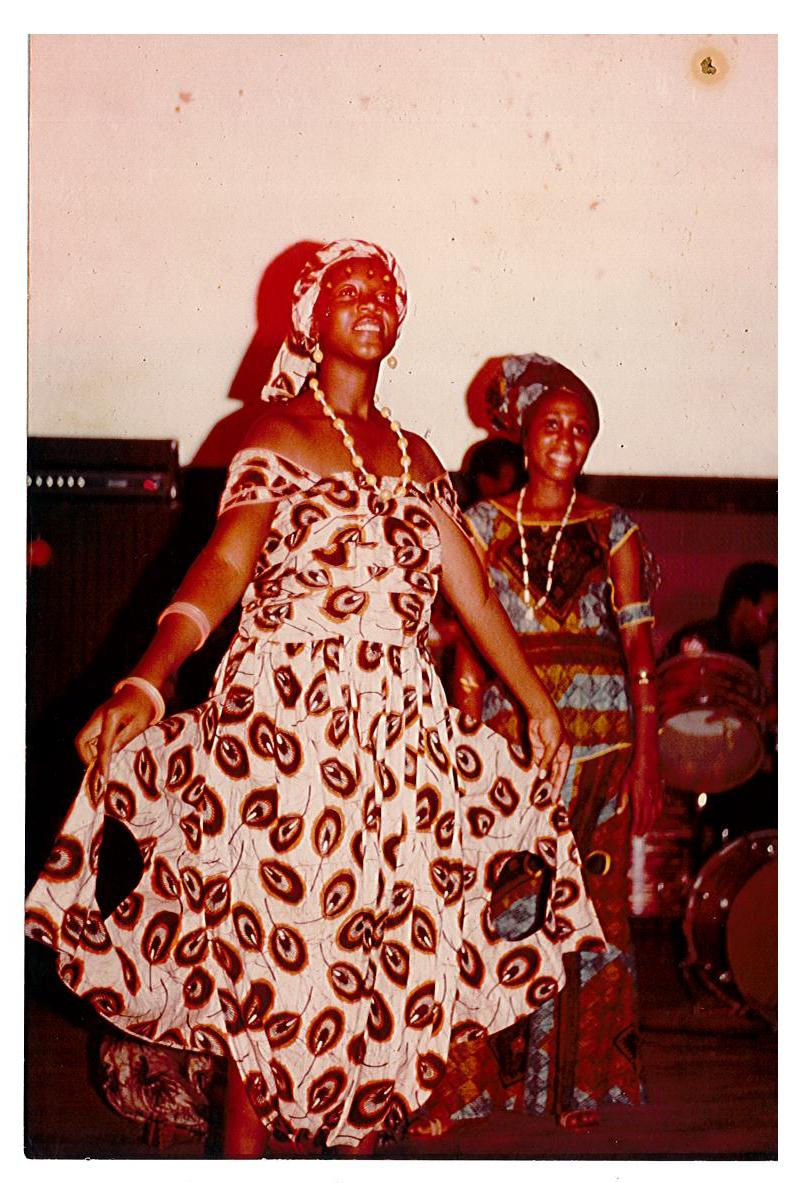 E. J Roye Memorial Auditorium 1981: Friiskies Class of 81 Senior Eunice Goaneh, shows of her African Attire as she competes in STC's 1981 Queen Contest. Eunice struts her stuff as another beautiful contestant looks on.